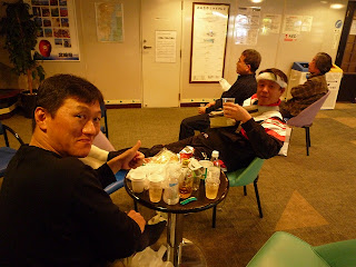 風呂に入り、その辺のテーブルを陣取って宴会。ここで1号は、大量のウイスキーをこぼしてしまう。何たる失態!